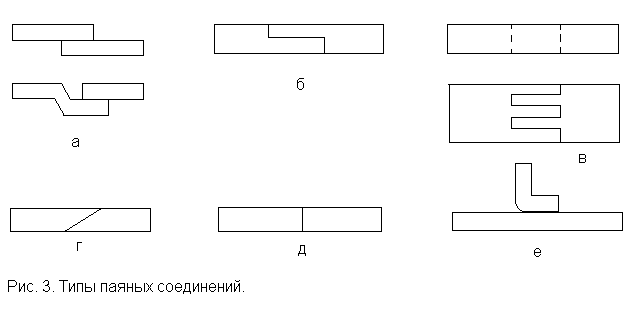 Основными типами паяных соединений являются стыковые и внахлестку. Остальные разновидности соединений являются комбинациями перечисленных. Например, плоские элементы могут быть соединены внахлестку (рис. 3,а), ступенчатым (рис. 3,б), гребенчатым (рис. 3,в), косостыковым (рис 3,г), стыковым (рис.3,д) и тавровым (рис. 3,е) соединениями.