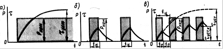 Продолжительный номинальный режим. Это режим работы при неизменной номинальной нагрузке, продолжающийся столько времени, что превышение температуры всех частей машины при неизменной температуре окружающей среды достигает установившихся значений tуст (рис а). Условное обозначение режима S1.