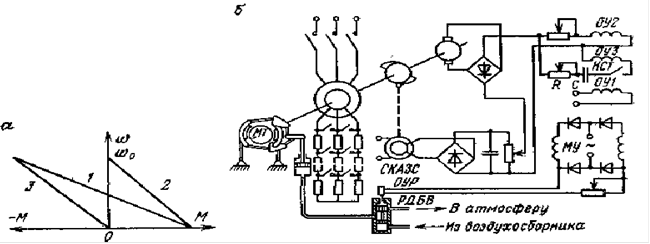 Наибольшее распространение получил метод дотягивания по системе асинхронный двигатель – механический тормоз. Механическая характеристика 1 (рис а) системы асинхронный двигатель – механический тормоз получена сложением механической характеристики двигателя 2 и механической характеристики механического тормоза 3, управляемого регулятором давления.