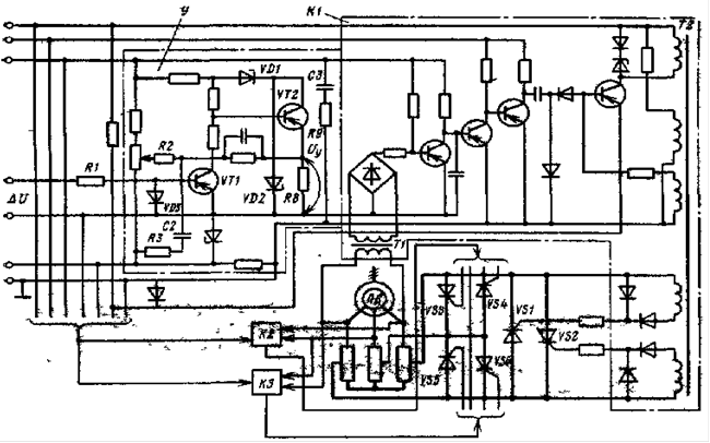 На вход усилителя У, являющегося общим для всех каналов управления, через резистор R1 подается сигнал ∆U, на его выходе формируется сигнал управления Uу , который связан с углом открывания транзисторов пропорциональной зависимостью. На транзисторе VT1 выполнен усилитель напряжения, а транзисторе VT2 – эмиттерный повторитель. Максимальные значения напряжений коллекторов транзисторов VT1 и VT2 ограничиваются стабилитронами VD1 и VD2. Переменным резистором R2 устанавливается необходимое смещение на входе усилителя, которое может быть как положительным, так и отрицательным. Поскольку сигнал смещения алгебраически суммируется с сигналом ∆U, то движение с требуемой малой скоростью может осуществляться при различных соотношениях между сигналами заданной и действительной скоростей.