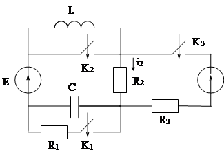 В коммутируемой цепи содержатся источники постоянных э.д.с. E или тока J, источники гармонической э.д.с. e=Em sin(wt +j ) или тока j =Jm sin(wt +j ) c частотой w =1000 c-1 или источник с заданной линейной зависимостью напряжения или тока от времени, три коммутируемых в заданные моменты времени ключа . Непосредственно перед первой коммутацией в цепи имеется установившийся режим.