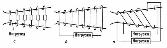По способу отвода электроэнергии М. г. разделяют на кондукционные и индукционные. В кондукционных М г. в рабочем теле, протекающем через поперечное магнитное поле, возникает электрический ток, который через съёмные электроды, вмонтированные в боковые стенки канала, замыкается на внешнюю цепь. В зависимости от изменения магнитного поля или скорости движения рабочего тела такой М. г. может генерировать постоянный, как правило, или пульсирующий ток. В индукционных М. г. (по аналогии с обычными электромашинными генераторами) электроды отсутствуют. Такие установки генерируют только переменный ток и требуют создания бегущего вдоль канала магнитного поля. Возможны различные формы каналов: линейная - общая для кондукционных и индукционных М. г.; дисковая и коаксиальная холловская - в кондукционных; радиальная - в индукционных М. г. По системам соединений электродов различают: фарадеевский генератор со сплошными или секционированными электродами (рис. 2 , а), холловский генератор (рис. 2 , б), в котором расположенные друг против друга электроды короткозамкнуты, а напряжение снимается вдоль канала за счёт наличия поля Холла, и сериесный генератор с диагональным соединением электродов (рис. 2 , в).