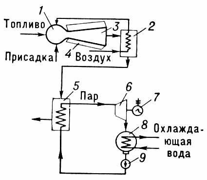 Отличительной особенностью М. г. является также возможность получения больших мощностей в одном агрегате - 500-1000 Мвт и сочетания их с паросиловыми блоками такой же мощности. Существуют три основных направления возможного промышленного применения М. г.: 1) ТЭС с М. г. (рис. 3 ) на продуктах сгорания топлива (открытый цикл); эти установки наиболее просты по своему принципу и имеют ближайшую перспективу промышленного применения; 2) атомные электростанции с М. г. на инертном газе, нагреваемом в ядерном реакторе (закрытый цикл); перспективность этого направления зависит от развития ядерных реакторов с температурой рабочего тела свыше 2000 K; 3) циклы с М. г. на жидком металле, которые весьма перспективны для атомной энергетики и для специальных энергетических установок сравнительно небольшой мощности, однако существующие на 1972 проработки этих циклов не позволяют судить определенно об их использовании в промышленной энергетике.