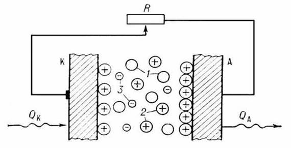 Напряжение, развиваемое ТЭП (0,5- 1 в ), - порядка контактной разности потенциалов, но меньше её на величину падения напряжения на межэлектродном зазоре и потерь напряжения на коммутационных проводах (рис. 2 ). Максимальная плотность тока, генерируемого ТЭП, ограничена эмиссионной способностью эмиттера и может достигать нескольких десятков а 1 см 2 поверхности. Для получения оптимальных величин работы выхода эмиттера (2,5-2,8 эв ) и коллектора (1,0-1,7 эв ) и для компенсации объёмного заряда электронов, образующегося вблизи электродов, в зазор между ними обычно вводят легко ионизируемые пары Cs. Положительные ионы цезия образуются при столкновении атомов Cs с быстрыми и тепловыми электронами как на горячем катоде (поверхностная ионизация) , так и в межэлектродном объёме (вследствие либо однократного соударения атомов Cs с быстрыми и тепловыми электронами, либо ступенчатой ионизации, при которой в результате 1-го соударения с электроном атом Cs переходит в возбуждённое состояние, а при последующих - ионизируется). В последнем случае ТЭП работает в так называемое дуговом режиме - наиболее употребительном. При используемых в современных ТЭП температурах электродов (1700-2000 К на катоде и 800-1100 К на аноде) их удельная мощность (в расчёте на 1 см 2 поверхности катода) достигает десятков вт, а кпд может превышать 20%.