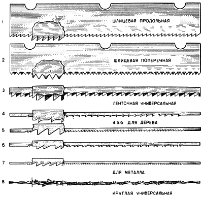 Пильную ленту изготовляют из ленточного пильного полотна, ширину и величину зубьев которого определяют в зависимости от величины станка и рода работы так же, как и для ручных лучковых пил. Заточку и развод производят по типу универсального профиля зубьев.