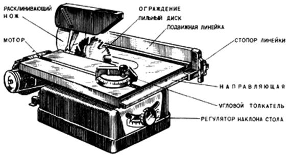 Циркулярная или дисковая пила состоит из станины с электродвигателем и шпинделя, на котором закрепляются пильные диски различного диаметра, толщины и с различной формой зубьев в зависимости от характера распиловки.