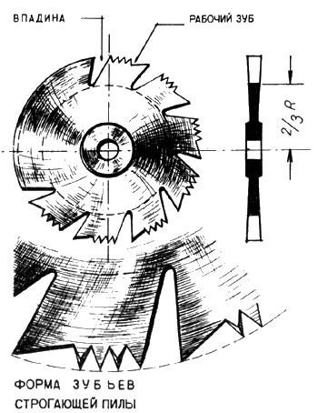 Пильный диск строгающей пилы в своей периферийной части имеет постоянную толщину, а начиная от 2/3 радиуса к центру толщина его уменьшается.