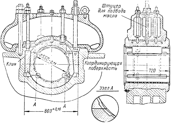 Для крупных горизонтальных компрессоров вкладыши выполняют обычно из четырех частей, как это указано на Рис.1. Благодаря такому устройству возможна вертикальная и горизонтальная подтяжки вкладышей с помощью нажимных винтов и клиньев, расположенных с двух сторон.