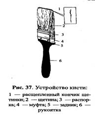 Кисть рекомендуется брать самую широкую, какую только возможно, для того, чтобы окраска шла быстрее, но не шире окрашиваемой поверхности. Для больших ровных участков подойдёт 75-миллиметровая или 100-миллимитровая кисть. Профессионалы используют даже 126-миллиметровую кисть, но это требует большой практики и усилий. На рис. 37 показаны основные элементы плоской кисти.