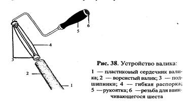 На рис. 38 и у каркаса валика, и у самого валика хорошие качества. Валик спирально обёрнут вокруг сердечника (в противном случае на окрашенной поверхности появятся полосы). Сердечник из пластика; прорезиненная бумага почти так же хороша, но менее гибкая. Каркас имеет гибкие распорки, удерживающие сердечник жёстко на месте (дешёвые модификации, не поддерживающие сердечник валика, стопорят работу).