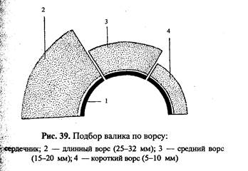 Валики продаются с различным ворсом – коротким, средним и длинным. Короткий ворс (обычно 5-10мм) не удерживает много краски, но лучше всего подходит для глянцевой краски, так как даёт тонкий, очень гладкий слой. Многоцелевой средний ворс (15-20мм) хорошо держит любой тип краски и даёт мягкий пунктированный эффект. Длинноворсистый валик (25-32 мм) накатывает толстый слой краски на неровности текстурированной, повреждённой или очень пористой поверхности и даёт сильно пунктированный эффект (рис. 39 ).