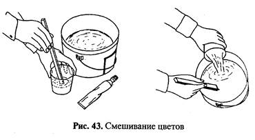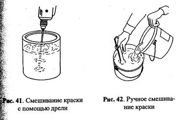 Краску можно смешать и вручную (рис. 42 ). Слейте примерно треть жидкой краски из верхней части банки во вторую ёмкость. Перемешайте оставшуюся краску до однородного состояния деревянной лопаткой. Металлическую ложку или проволоку брать не рекомендуется, так как внутренняя часть банки может иметь предотвращающее ржавление покрытие, которое вы можете повредить. Добавляйте жидкую краску, отлитую в ёмкость, постепенно, маленькими пропорциями, постоянно перемешивая, пока не вольёте всю краску. Несколько раз перелейте краску из банки в ёмкость и обратно, чтобы она хорошо смешалась.