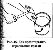 Чтобы предотвратить переливание краски, зачастую скапливающейся на бортике банки, пробейте маленьким гвоздём несколько дырочек по окружности бортика, (рис. 45 ) и краска, собирающаяся на нём, через эти дырочки будет выливаться обратно в банку. Гвоздик держите под рукой, чтобы снова вскрывать отверстия, потому что густая краска быстро снова забьёт их. Но если вы не собираетесь использовать всю краску сразу, не стоит прибегать к этому приёму, потому что крышка банки не закроет этих отверстий, и попавший внутрь воздух вызовет образование плёнки на краске.
