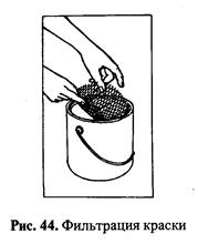 Выпавшие щетинки, засохшие куски краски и частицы грязи, неизбежно попадающие в краску, могут испортить всю работу, а выловить их почти невозможно. Вырежьте несколько кругов из проволочной сетки размером с отверстие банки с краской и, если в краску попадает мусор, просто осторожно положите эту сетку на поверхность краски. Мусор прилипнет к нижней стороне сетки (рис. 44 ). Следует отметить, однако, что этот приём «не срабатывает» в случае «некапающей» краски из-за её слишком густой желеобразной консистенции.
