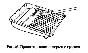 Возьмите специальное корытце для валика и выстелите его толстой алюминиевой фольгой. Налейте краску к корытце примерно наполовину и погрузите туда валик (рис. 46 ).