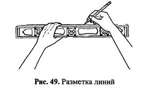 Для того чтобы разместить линии, возьмите ватерпас как линейку, держа её так, чтобы пузырёк в трубке в середине уровня совмещался с горизонтальной линией, а пузырьки на концах уровня совместились с вертикальными линиями (рис. 49 ).