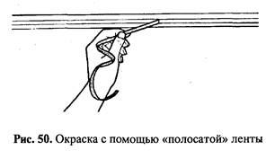 Можно окрасить стену с помощью «полосатой» ленты. Расположите ленту так, чтобы удаляемые полоски совпадали с вашими линиями, затем оторвите нужное число полосок (рис. 50 ).