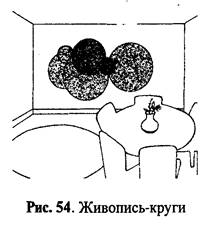 Можно использовать стенную живопись, чтобы оживить комнату, например как показано на рис. 54 . Чтобы не рисовать по влажной краске, начните с обеих сторон после нанесения рисунка мелом с помощью решётки на стену. Наклейте по контуру первого круга и покройте его краской с помощью муштабеля. Удалите ленту и закрасьте перекрывающиеся круги по рисунку. Цвета такого сложного рисунка, как этот, не должны быть слишком яркими, ибо кричащие тона могут оказывать подавляющее действие, особенно в маленьком помещении.