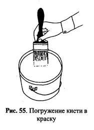 Итак, всё готово для начала работы. Опустите щетину кисти в краску на 1/2-1/3 её длины (рис. 55 ). Затем слегка постучите муфтой о бортик ёмкости, чтобы стряхнуть лишнюю краску. Не вытирайте кисть о бортик – так удаляется слишком много краски. Не следует также погружать кисть слишком глубоко в краску. В этом случае лишняя краска будет капать или стекать по рукоятке. Если же краска засохнет внутри муфты, кисть будет испорчена.
