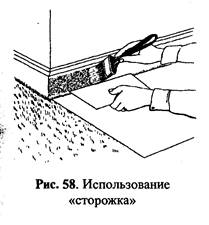 Для защиты от лишних мазков по прилегающим к окрашиваемой поверхности участкам многие маляры используют металлический ил пластмассовый «сторожок» - лопатку для краски (рис. 58 ). Она продаётся в магазинах.