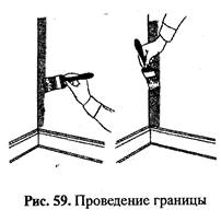 В начале работы необходимо провести кистью границу (даже если вы всю поверхность красите валиком) – закрасьте полосу около 50 мм шириной в углу между соединяющимися поверхностями (рис. 59 ).