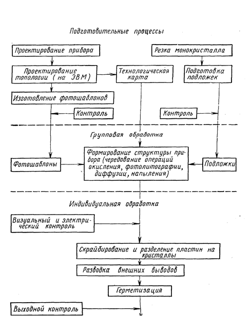 Общая технологическая схема процессов производства полупроводниковых приборов показана на рис. 1. Она включает комп лексы подготовительных процессов, процессов групповой и индивидуальной обработки.