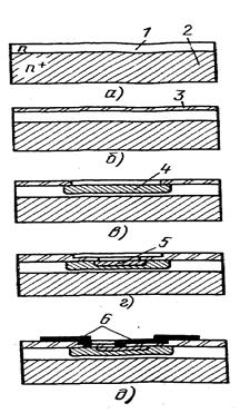 Рис. 3. Технологическая схема изготовления n-р-n-эпитаксиально-планарного кремниевого транзистора: а - исходная эпитаксиальая структура, б - структура с защитной оксидной пленкой, в - фотолитография и диффузия базы, г - окисление, фотолитография и диффузия эмиттера, д - формирование металлических контактов; 1 - эпитаксиальный слой, 2 - кремниевая пластина, 3 - защитная пленка оксида кремния, 4 - р-область базы. 5 - n -область эмиттера, 6 - металлические контакты