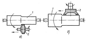 Рис. 5 Калибровка слитка круглым шлифованием: а,б - переферией и торцом круга,1 - ситок, 2 -шлифовальный круг