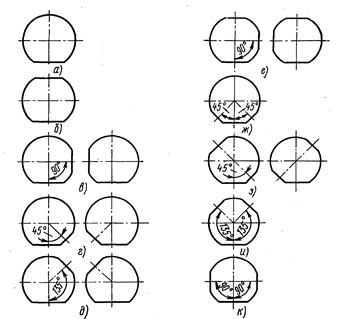 После калибровки Цилиндрической поверхности на слитке выполняют базовый и дополнительные (маркировочные) срезы. Базовый срез делают для ориентации и базирования пластин на операциях фотолитографии. Дополнительные срезы предназначены для обозначения кристаллографической ориентации пластин и типа проводимости полупроводниковых материалов. Примеры расположения базовых и дополнительных срезов показаны на рис. 6, а - к. Ширины базового и дополнительных срезов регламентированы и зависят от диаметра слитка. Базовый и дополнительные срезы изготовляют шлифованием на плоскошлифовальных станках чашечными алмазными кругами по ГОСТ 16172-80 или кругами прямого профиля по ГОСТ 16167-80. Зернистость алмазного порошка в кругах выбирают в пределах 40/28-63/50 мкм. Один или несколько слитков закрепляют в специальном приспособлении,ориентируя необходимую кристаллографическую плоскость параллельно поверхности стола станка. В зону обработки подают смазочно-охлаждающую жидкость (например, воду).