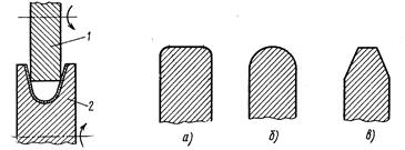 В производстве чаще всего используют способ формирования фасок профильным алмазным кругом. Схема обработки пластины 1 алмазным кругом 2 показана на рис.. 10. Этим способом могут быть изготовлены фаски разнообразной формы (рис. 11, а-в). На практике чаще всего формируют фаски, форма которых показана на рис. 11, а. В процессе обработки пластина закрепляется на вакуумном столике станка и вращается вокруг своей оси. ×астота вращения пластины 10-20 об/мин, алмазного круга 4000-10000 об/мин. Алмазный круг прижимается к пластине с усилием 0,4-0,7 Н. Ось вращения круга перемещается относительно оси вращения вакуумного столика так, чтобы обработке