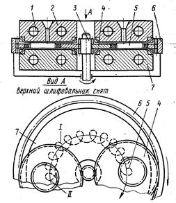 Схема двустороннего шлифования пластин свободным абразивом показана на рис. 13.Пластины 5 помещают в сепараторы 4, выполненные в виде пластин с наружным зубчатым венцом. Зубья сепараторов входят в зацепление с зубчатыми шестернями 3 и 6. Внутренняя шестерня 3 имеет наружный зубчатый венец, а внешняя шестерня 6-внутренний. Шестерни 3 и 6 приводятся во вращение и через зубчатые зацепления вращают сепараторы. Одновременно сепараторы перемещаются вокруг оси шлифовальников 2, 7. Центры отверстий в сепараторах не совпадают с центрами самих сепараторов, поэтому при их вращении пластины совершают дополнительное движение вокруг центров сепараторов, способствующее более равномерной обработке пластин и равномерному износу шлифовальников. Нижний шлифовальник 7 неподвижно закреплен на станине станка, а верхний шлифовальник 2 свободно устанавливается на обрабатываемых пластинах.