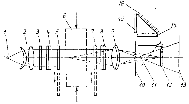 Источник света 1 (кинопроекционная лампа К12 или ртутная лампа СВДШ-250) размещен в фокальной плоскости конденсора 2 (фокусное расстояние 180 мм). Параллельный пучок лучей после конденсора проходит через светофильтр 3, поляризатор 4 (поляроид, вклеенный между защитными стеклами), слюдяную пластинку 5 в 1/4 волны и падает на исследуемый образец 6.