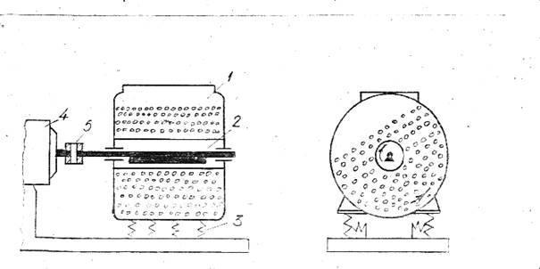Рис2.схема вибрационной мельницы:1-корпус-барабан,2-вибратор вращения,3-спиральные