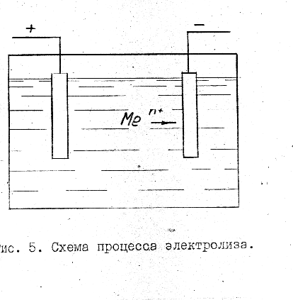 Этот способ наиболее экономичен при производстве химически чистых порошков меди. Физическая сущность электролиза (рис.5) состоит в том, что при прохождении электрического тока водный раствор или расплав соли металла, выполняя роль электролита, резлагается, металл осаждается на катоде, где его ионы разряжаютсяМе+ne=Me Сам процесс электрохимического превращения происходит на границе электрод (анод или катод) - раствор. Источником ионов выделяемого металла служат как правило, анод, состоящий из этого металла, и электролит, содержащий его растворимое соединение. Такие металлы как никель, кобальт, цинк выделяются из любых растворимых в виде однородных плотных зернистых осадков. Серебро и кадмий осаждаются из простых растворов в форме разветвленных кристаллитов, а из растворов цианистых солей - в виде плотных осадков. Размеры частиц осаждаемого порошка зависят от плотности тока, наличия коллоидов и поверхностно активных веществ. Очень большое влияние на характер осадков оказывает чистота электролита, материал электрода и характер его обработки.