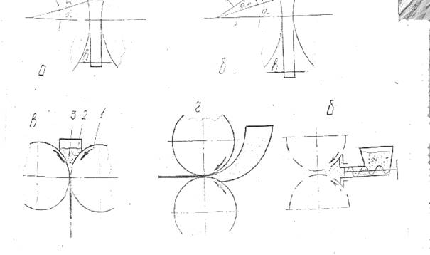 Рис. 10 Схема прокатки: а- компактного металла, б-д - порошка, в- вертикальная, г- горизонтальная