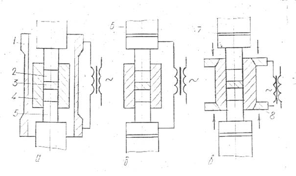 б- прямой нагрев при подводе тока к пуансону,в- прямой нагрев при подводе тока к