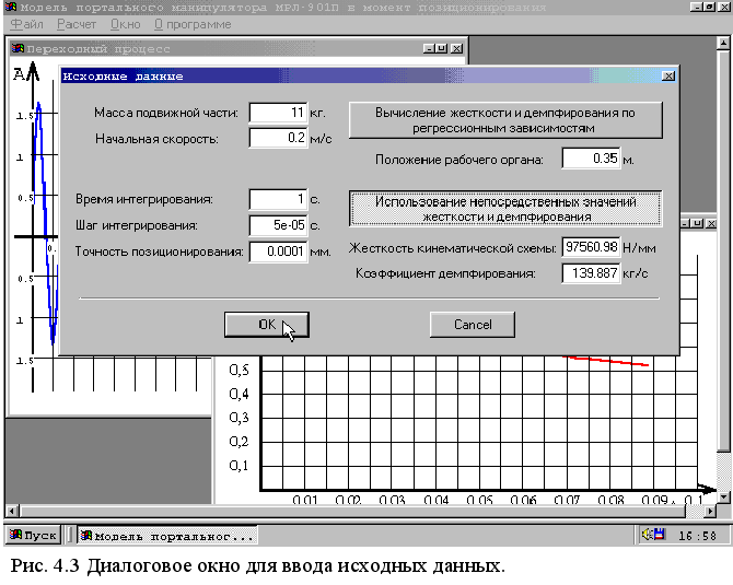 Для решения задачи выбора оптимальной скорости перемещения звеньев манипулятора с шаговым двигателем, с целью увеличения его быстродействия, необходимо учитывать переходные процессы возникающие при позиционировании рабочих органов. Переходные процессы в виде затухающих механических колебаний возникают под действием инерционных нагрузок и приводят к увеличению времени позиционирования при выполнении переходов технологического процесса, например, при сборке, сверлении, контроле и др. Для планирования траектории необходимо знать время затухания колебаний до значения допустимой погрешности позиционирования, при котором рабочий орган манипулятора может продолжать движение. С целью определения времени такого переходного процесса создана модель манипулятора портального типа с консольной подвижной частью.