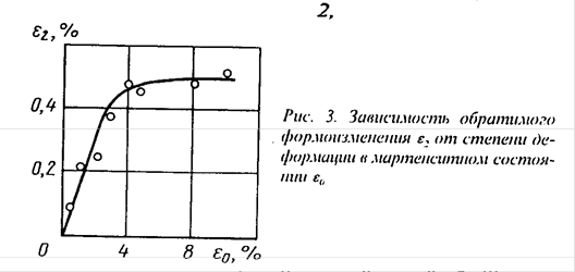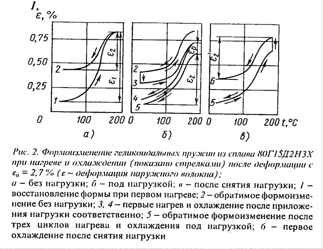Выводы. 1. Наилучшим способом формирования обратимой памяти в изделиях из сплава 80Г15Д2НЗХ является пластическая деформация в мартенситном состоянии со степенью 5-10 %. Несколько менее эффективным способом является приложение к изделию нагрузки в процессе мартенситного превращения. Совместное воздействие деформации и нагрузки не приводит к существенному повышению степени обратимого формоизменения.