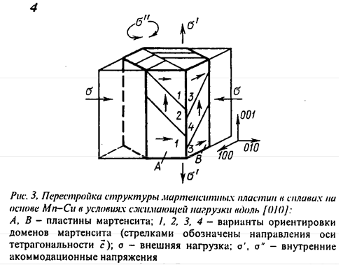 Согласно [б], при ГЦК -» ГЦТ-превращении в Mn-Cu-кристалле образуются пластины мартенсита, граничащие по плоскостям {110}. Каждая из пластин состоит из мартенситных доменов двух вариантов со взаимно перпендикулярными тетрагональными осями с . Домены имеют двойниковую ориентацию с плоскостями двойникования {110}, составляющими угол 60° с границами мартенситных пластин. Границы двойников легко подвижны и при приложении внешних напряжений перемещаются внутрь неблагоприятно ориентированного двойника. Это приводит к формированию мартенситной текстуры с преобладанием доменов с осью вдоль направления сжатия. Однако при неблагоприятной ориентировке мартенситной пластины, для которой направление деформации параллельно плоскости двойникования, перемещение существующих границ двойников невозможно (фактор Шмида равен 0).