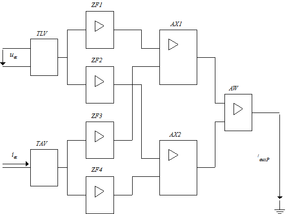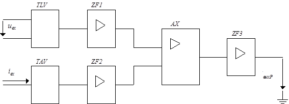 Аналоговые измерительные преобразователи активной мощности осуществляются на основе аналогового перемножения мгновенных значений непрерывно изменяющихся напряжения и тока. Выходное напряжение зависит от каждой из входных величин (напряжения или тока) при постоянном значении второй из них. Указанная зависимость реализуется в интегральном перемножителе типа К525ПС2, который представляет собой четырехквадрантный аналоговый перемножитель сигналов, на основе использования свойств электронно–дырочных переходов транзистора и диода, а именно: пропорциональности тока коллектора току базы; экспоненциальной и логарифмической зависимостей тока коллектора от напряжения на эмиттерном переходе транзистора и напряжения на диоде от его прямого тока соответственно.