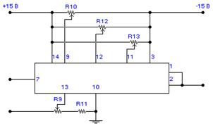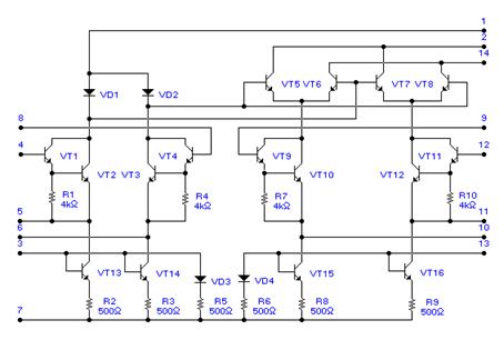 Перекрестные связи коллекторов этих транзисторов обеспечивают инверсию сигналов, необходимую для четырехквадрантного умножения. Входные каскады на транзисторах