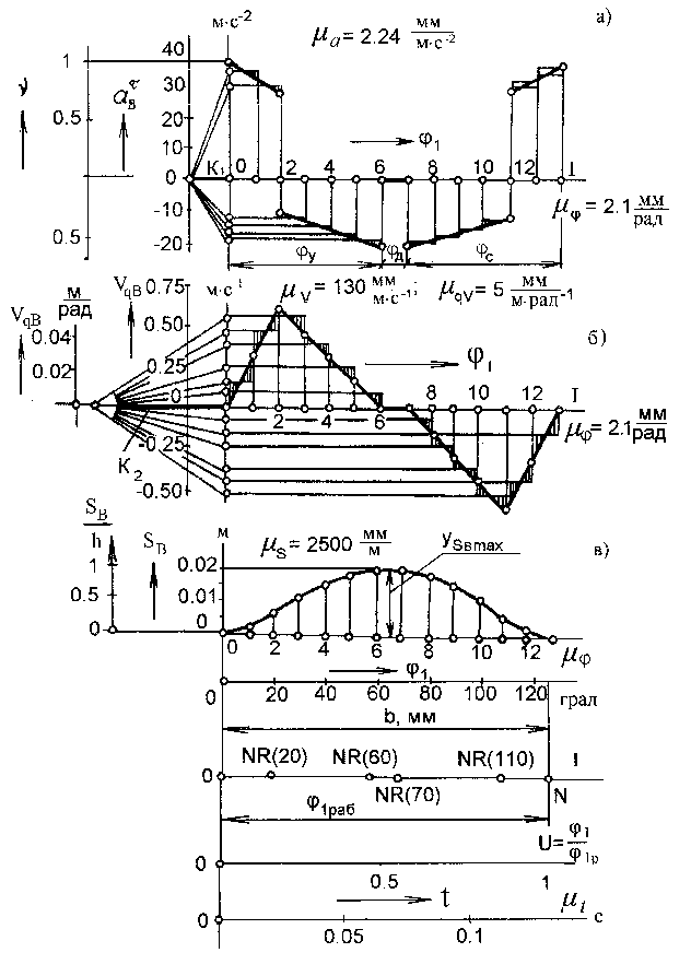 В табл. 1...5 приведены некоторые законы движения толкателя, представленные в виде безразмерных коэффициентов относительных значений ускорений