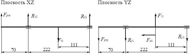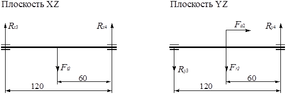 Схема нагружения этого вала представлена на рис. 4. Соответствующие силовые факторы были уже вычислены выше. Определяем величины реакций.