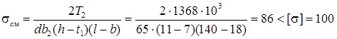 Передача крутящих моментов от колёс и шкивов на валы осуществляется посредством шпонок. В связи с этим необходимо проверить прочностные свойства шпоночных соединений на смятие по наиболее нагруженной шпонке. Рассматриваемая шпонка имеет размеры b ´h ´l =18´11´140 мм, глубина паза t 1 = 7 мм. Передаваемый крутящий момент T2 = 1362 Н·м.