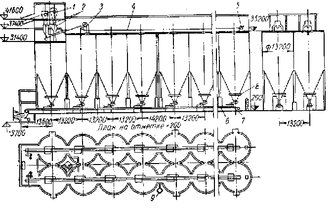 Склад состоит из типовых секций по восемь бункеров. Поэтому при привязке типового проекта к определенному заводу количество бункеров следует брать кратным восьми. Диаметр бункера 13 м, высота 35 м, емкость 2500 т. Сооружаются бункера из монолитного железобетона в передвижной опалубке. Выпускные воронки бункеров металлические. Для предотвращения зависания угля в воронках имеется пневмообрушивающее устройство.