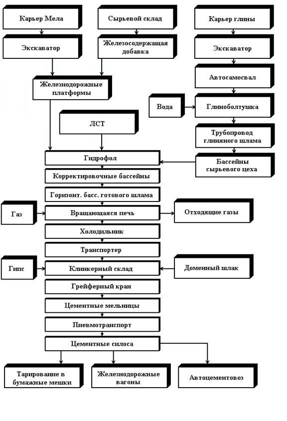 Сырьем при производстве цеманта по мокрому способу являются следующие компоненты: карбонатный компонент—мел, силикатный компонент—глина, железосодержащие добавки—пиритные огарки, конверторный шлам, железистый продукт.