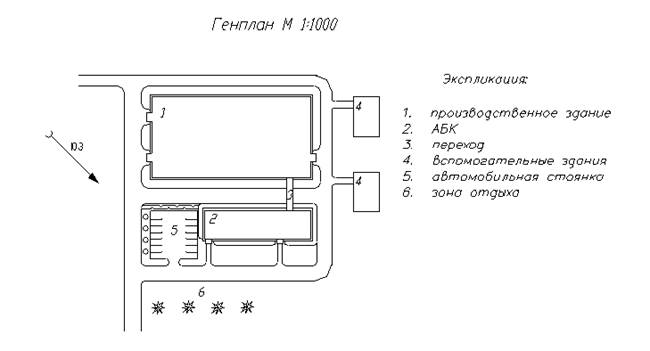 Расположение зданий и сооружений на генеральном плане принято в соответствии с технологической схемой, а также с учетом необходимости блокирования зданий и зонирования территории. Также предусмотрено благоустройство (озеленение, стоянка для автомашин, дороги).