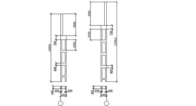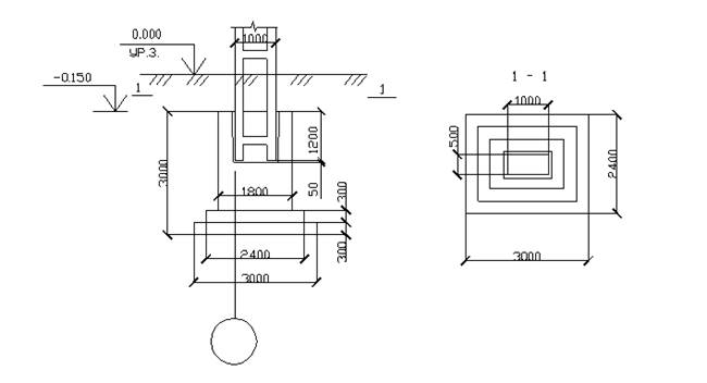 Колонна площадью сечения 1,0 x 0,4 и 0,5 м, подколонник площадью сечения 1,8 x 1,2 м, глубина стакана 0,95 м. Фундамент ФГ 31-35(см. рис. 4.1.1.). Площадь сечения подошв: первой – 3,3 x 2,4 x 0,3 м, второй - 2,4 x 1,8 x 0,3. Высота фундамента 3,0 м. Объем бетона 7,97 м3 .
