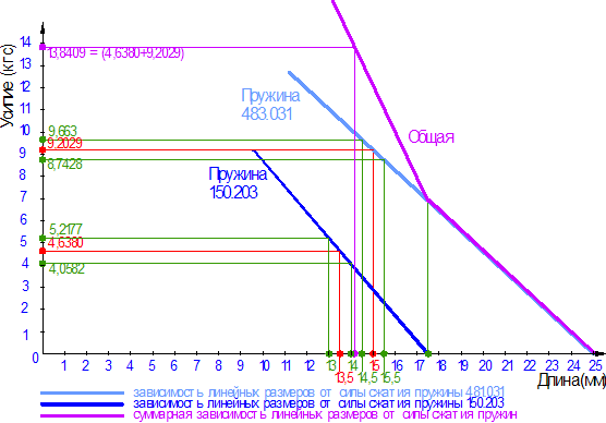 Из диаграммы видно, что общее усилие создаваемое сжатыми пружинами (13,8 кгс) намного выше требуемого (6 кгс). В целях экономии целесообразней оставить только одну пружину – 483.031. Т.к. для её сжатия до размера 15±0,5мм. необходимо усилие 9±0,4кгс., что удовлетворяет требованиям предъявляемым к узлу.