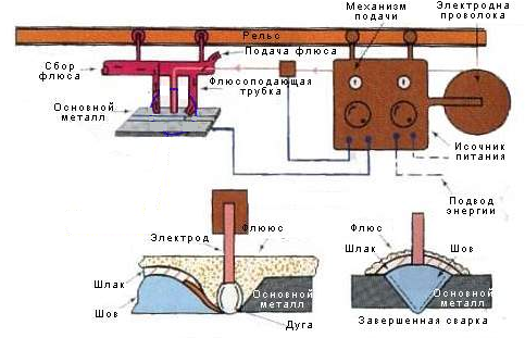 Сварка под слоем флюса в основном автоматический или полуавтоматический процесс. Вид автоматической сварки обеспечивает высокую производительность (до 40 кг в час) и качество сварного шва. Для этого процесса следует правильно выбрать напряжение и скорость подачи электрода. Значение этих параметров должно обеспечивать горение дуги под слоем флюса, но в то же время на определенной высоте над основным металлом.
